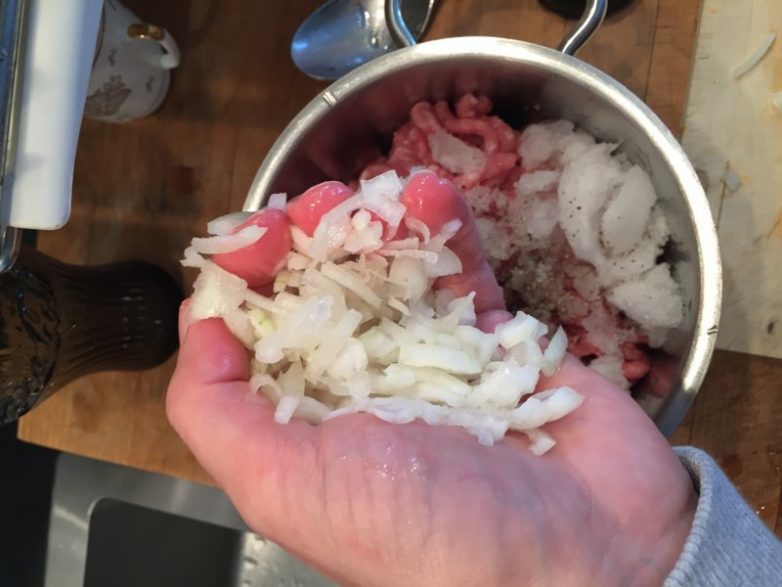 лук мелко нарубить и отжать, чтобы из него потек сок, выложить в фарш и хорошенько перемешать.