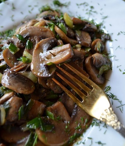 Грибы нарежьте на крупные дольки. Жарьте в сливочном масле 10-12 минут. Добавьте вино. Когда вино выпарится, добавьте к шампиньонам соль, перец и сахар, перемешайте и добавьте нарезанный зелёный лук. Жарьте лук с грибами 3-5 минут, до мягкости лука. Переложите шампиньоны на блюдо и посыпьте свежим укропом.