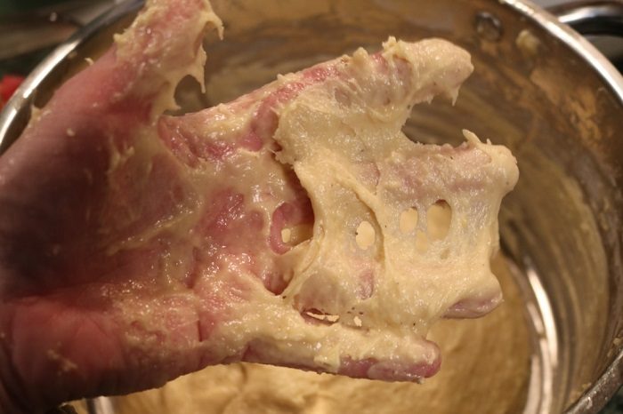 В отдельной миске взбей масло. К нему добавь опару, муку, сахар и цедру. Замеси тесто. Потом добавь соль и продолжай месить тесто, пока оно не станет мягким и эластичным.
