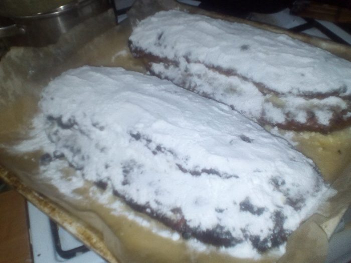 После приготовления дай штоллену остыть и только после этого смажь его при помощи кисточки растопленным сливочным маслом, а затем обсыпь и хорошо натри смесью из сахарной пудры и сахара.