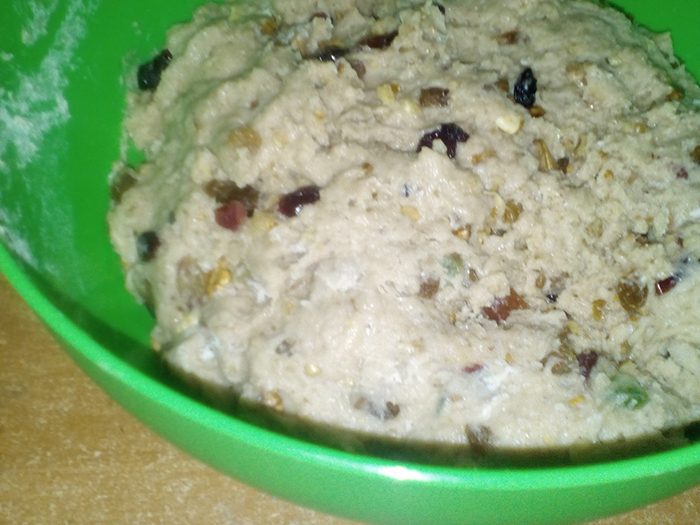 Теперь переходим к сухофруктам и орехам. Достань тесто и переложи его на рабочую поверхность. Обомни заготовку, выложи в нее миндаль, цукаты, изюм, апельсиновые корки, грецкие и лесные орехи и замеси их в тесто вручную. Так орехи и цукаты сохранят свою целостность.