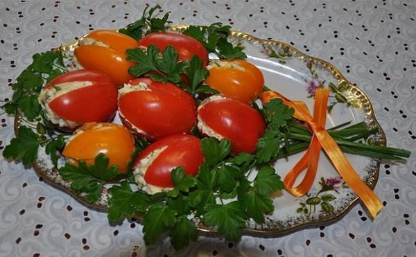 Больше всего меня покорила именно эта нарядная закуска в виде тюльпанов. Кроме того, помидоры, фаршированные творогом и чесноком, — это действительно очень вкусно.