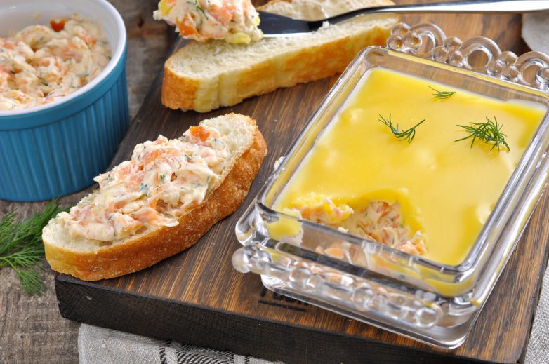 Форель отделить от кожи и костей, при помощи ножа и вилки разделить на мелкие волокна. К разобранной рыбе добавить ароматизированное сливочное масло, мелко нарезанный укроп, кайенский перец, сок лимона — всё перемешать вилкой. Затем добавить взбитые сливки и ещё раз перемешать.