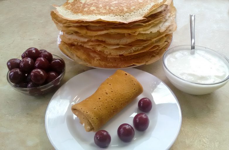 Дрожжевые блины с начинкой из вишни и сметаны