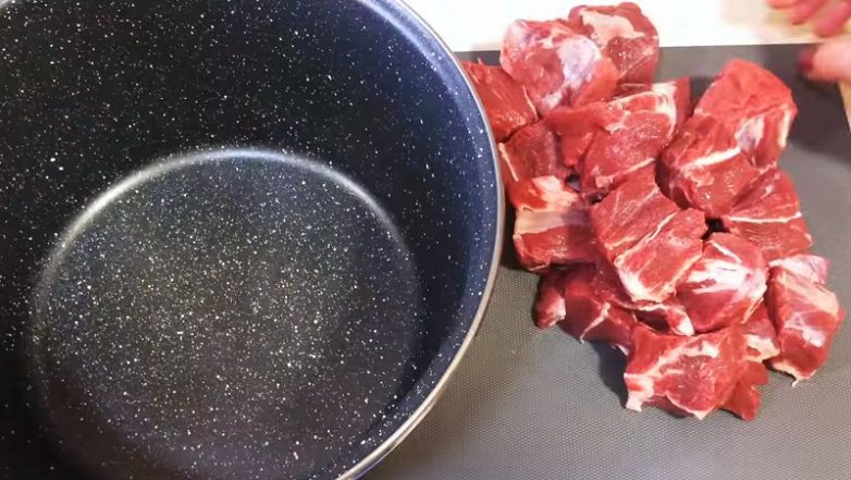Нарежь мясо на средние кусочки поперек волокон.