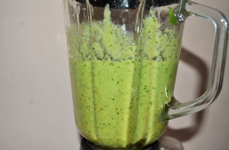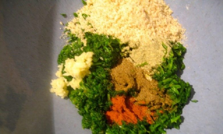 Орехи, чеснок, кинзу и лук измельчи в блендере или мясорубке. Теперь нужно хорошенько ее вымесить, а после добавить соль и специи.