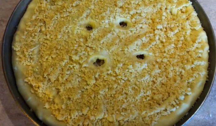 Посыпь пирог сверху крошкой. Обрати внимание, что отверстия засыпать не нужно!