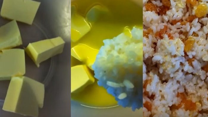 Для начинки нужно слегка растопить 3 столовые ложки сливочного масла и добавить к нему весь рис, а затем изюм. Хорошенько всё перемешай.Также, по желанию, в начинку можно добавить курагу и чернослив.