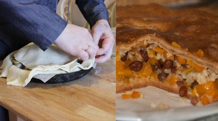 Традиционным считается в татарской кухне балиш с мясом и картофелем, но в семье моей подруги всегда делали вот такой вариант — с изюмом или с курагой.