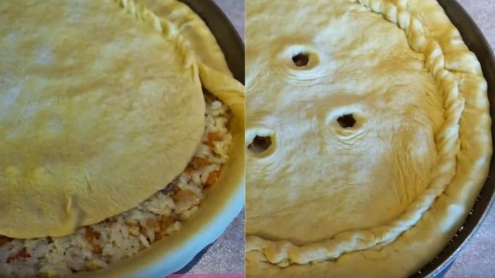 Из 1/3 теста сделай крышечку для пирога и скрепи края. Далее нужно сделать в пироге 2–4 отверстия.