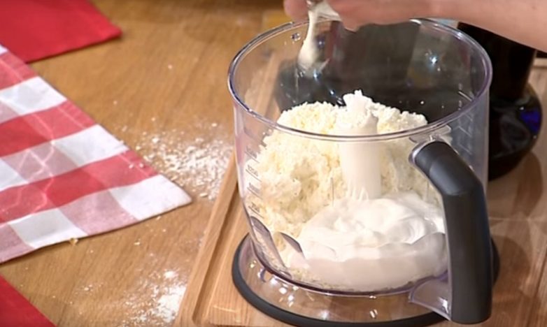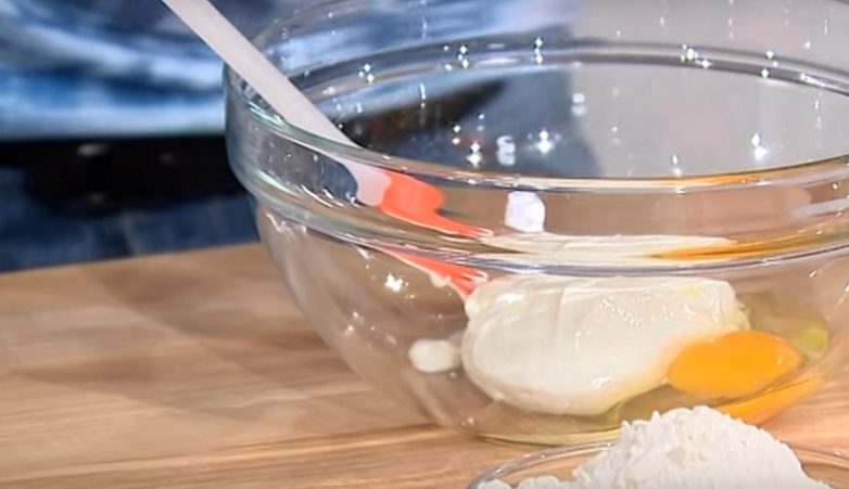 Приготовление торта следует начинать с теста. Для этого соедини в глубокой емкости сметану и яйцо, затем добавь муку и разрыхлитель. Замеси тугое тесто.