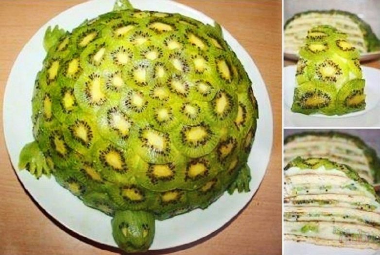 Сверху обильно смажь кремом и укрась по бокам киви, чтобы получилась черепаха. Торт готов!