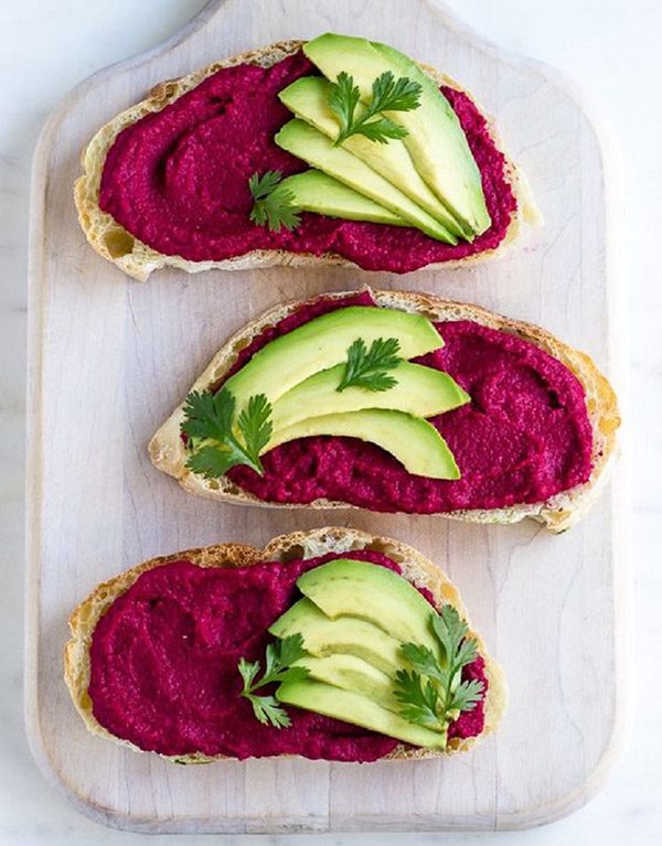А это бутерброд со свеклой и плавленым сыром. Для его приготовления — запеки свеклу и мелко ее натри. Затем мелко нарежь зеленый лук. Добавь к свекле тертый плавленый сырок, нарезанный лук и черный перец по вкусу.Вкуснее всего сочетается эта паста с белым хлебом. А если добавить авокадо и петрушку, то получится красиво и очень необычно. А еще такими бутербродами можно угостить друзей, заглянувших в гости.
