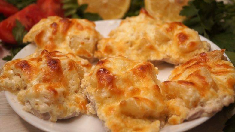 Я сегодня готовлю из куриной грудки, разрезаем ее на части. Кусочки отбиваем с двух сторон. Мясо солим, добавляем перец и все хорошенько перемешиваем. Тертый сыр смешаем со 150 гр. Сметаны. Мясо укладываем на противень, на мясо укладываем кусочки ананаса, сверху кладем понемногу сыра со сметаной. Ставим в разогретую духовку и запекаем при 200 градусах 40 минут, до румяности.Подробности и процесс приготовления Вы можете посмотреть в моем коротеньком видео ниже.