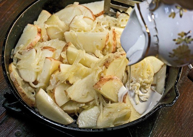 По сути мы получаем томленый картофель. Его собственной влаги, влаги пассерованного лука и сливок при наличии плотной крышки, очень умеренной температуры под сковородой и определенного времени вполне для томления достаточно. При желании, если на последней минуте с умом форсировать температуру, можно наладить корочку — для тех, кто любит «поджаристое». Как ни странно, значительную часть вкусовой нагрузки во всей этой «истории» берет на себя лук. Точнее — его количество. Ещё точнее — лук в сочетании со сливочными нотками как бы облагораживает посконную простоту «просто картошки». Странность же в том, что теоретически такое количество лука, который при пассеровании карамелизуется, должно было бы отправить картофель в сладкую (или сладковатую) ипостась. Но этого не происходит. И я не знаю, почему, хотя кое-какие подозрения есть. Но это, думаю, не столь важно.