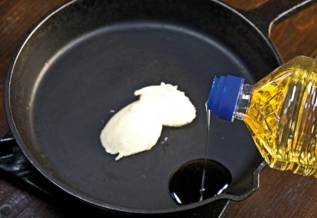 … и две-три столовые ложки масла растительного, которые на слабо разогревающейся сковороде смешиваются без какого-либо постороннего участия и столь же слабо, как сковорода, разогреваются.