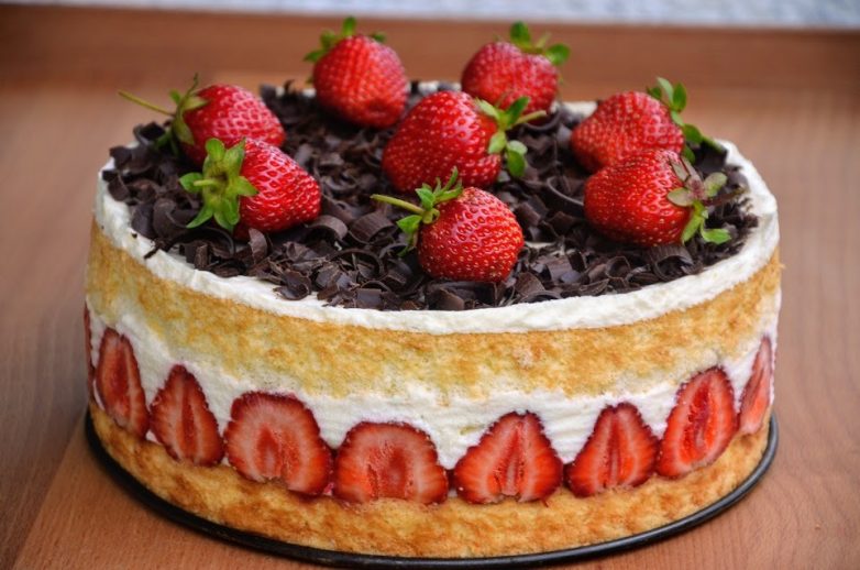 Как только верхний слой торта застынет, снимаем разъемный борт. Аккуратно отделяем бумагу. Посыпаем бисквитный торт с клубникой шоколадной стружкой. Украшаем торт свежей клубникой.Французский торт «Фрезье» готов. О-очень вкусный, воздушный, прям тает во рту!!!