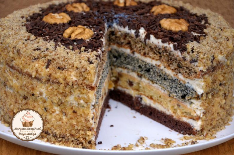 6) Сборка торта. На блюдо выкладываем шоколадный корж и покрываем кремом. Сверху кладем корж с изюмом, обильно смазываем кремом, выкладываем маковый корж, покрываем слоем крема. Выкладываем верхний — ореховый корж, обмазываем верх и бока торта оставшимся сметанным кремом.