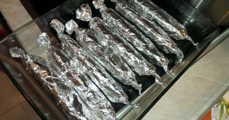 Выложи колбаски в фольге на противень. Выпекай в духовке 1 час при температуре 200 градусов.
