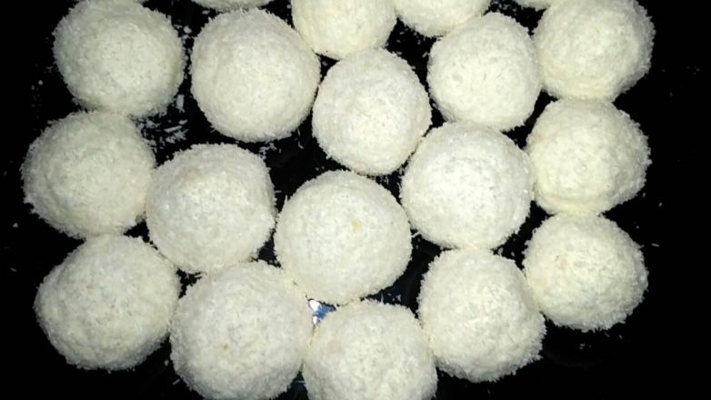 3.Приступаем к формированию шариков.Смочим руки водой, кладем на ладонь чайную ложку творожной массы, делаем лепешку и посредине кладем орешек.Скатываем шарик.Затем кладем его на тарелку с кокосовой стружкой и обваливаем со всех сторон.Так поступаем с каждым шариком.