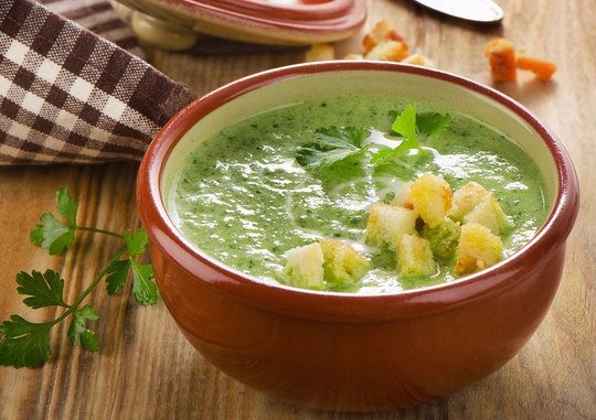 Немного разнообразия и новизны не помешает весеннему меню для похудения. Нежный крем-суп из петрушки впишется в него идеально. Доводим до кипения воду в кастрюле, на минуту опускаем в нее 4 пучка петрушки, а затем перекладываем ее в миску с ледяной водой. Хорошо просушиваем зелень на полотенце и шинкуем. Растапливаем в кастрюле 3 ст. л. сливочного масла, обжариваем измельченную луковицу с зубчиком чеснока до размягчения. Вливаем 800 мл куриного бульона и 200 мл теплых сливок. Доводим смесь до кипения, провариваем в течение 20 минут на слабом огне, после чего закладываем всю петрушку. Продолжаем варить зелень еще 5 минут, вводим лимонный сок по вкусу, добавляем соль и любимые специи. Слегка охлаждаем суп, пюрируем блендером и пропускаем через мелкое сито. Перед подачей украсьте тарелки с супом листьями свежей петрушки и подайте к нему сухарики.