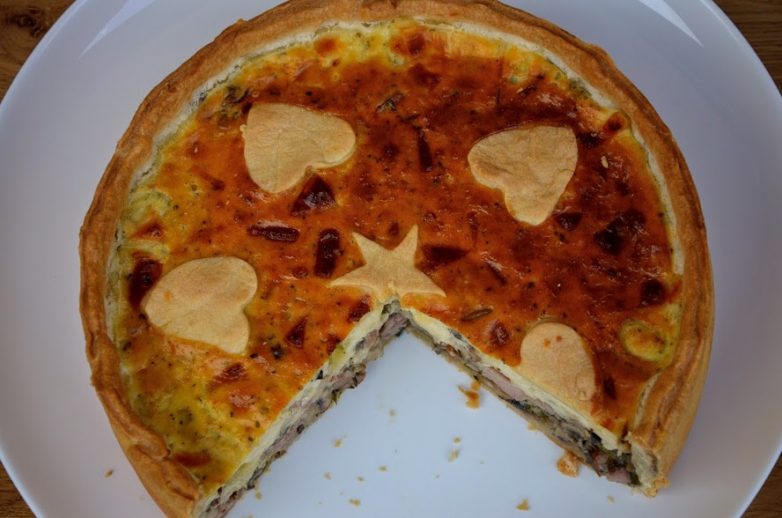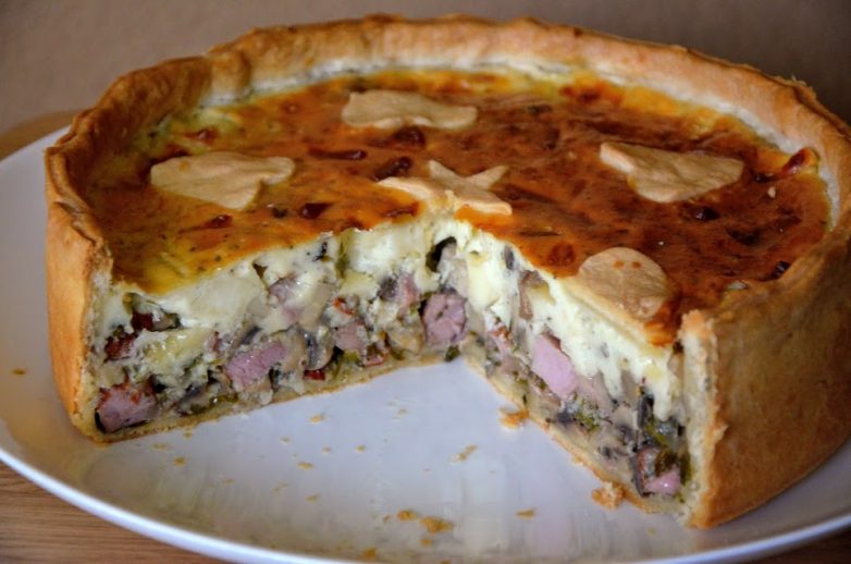 Заливной пирог на песочном тесте с грибами ветчиной и сыром