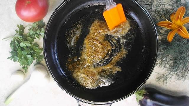 Целые овощи обжарьте на растительном масле, до полуготовности, для салата по-корейски овощи должны быть немного сырыми. Перец — с двух сторон будет достаточно, а баклажаны — с четырех. Дождитесь когда слегка подрумянится корочка и переворачивайте.