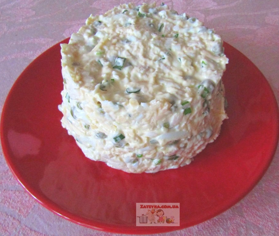 Салат с куриным филе, яйцами, сыром и зеленым горошком