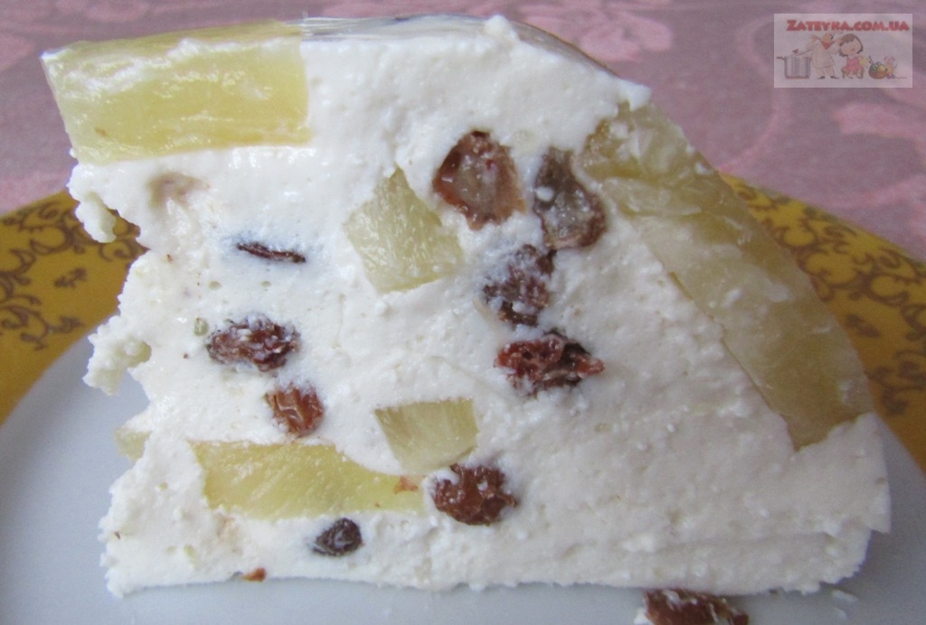 Растворяем желатин в ананасовом соке, примерно 20 минут. Блендером взбиваем творог с ванильным сахаром, сгущенкой и сметаной.Разбухший в соке желатин растворим на водяной бане или на медленном огне. Соединяем взбитую творожную массу с ананасами (кубиками) и желатином в ананасовом соке, добавляем изюм, предварительно замоченный в кипятке. Заливаем десерт в любую форму или же по нескольким индивидуальным формочкам, и ставим застывать в холодное место. Десерт получается необыкновенно воздушным, легким, нежным и вкусным!