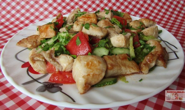Летом, в разгар созревания вкусных и полезных овощей, приготовим легкий салат с овощами и курицей.