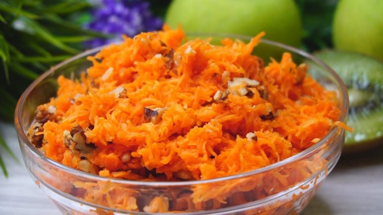 Сырую морковь очистим и натрем на мелкой терке, грецкий орех нарубим ножом. Собираем салат в миску кладем морковь орешки, 2 ст.л. лимонного сока, 2 ст.л. меда и все хорошо перемешиваем. Салатик готов.