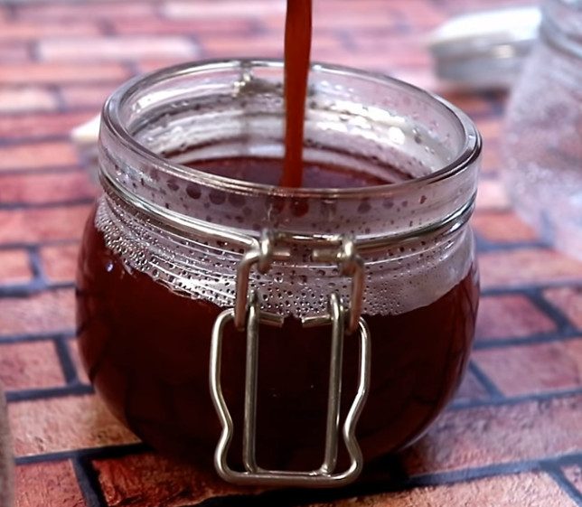 6. Конечную стадию определяем на вкус. Я варил до тёмного цвета, почти чёрный. Готовый соус переливаем в чистые банки, закрываем крышкой и храним в холодильнике. Соус можно сразу употреблять, хранить можно 1 год. Из одного арбуза (1,5 кг) получилось 300 мл готового соуса.