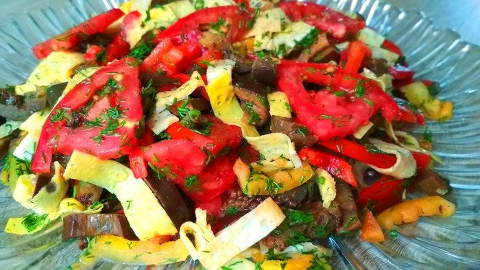 8) Собираем салат. Соединяем остывшие баклажаны, болгарский перец, помидоры, укроп, яичные блинчики и заправляем растительным маслом с чесноком. Перемешиваем.