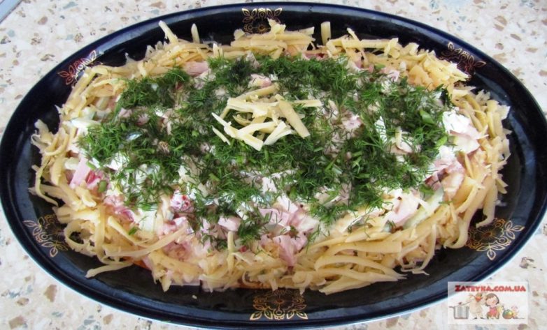 Салат с вареной колбасой, яйцами, сыром и овощами