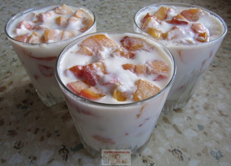 Персики и абрикосы помыть, обсушить и нарезать кубиками. В стаканы выкладываем порезанные абрикосы, сверху наполовину заливаем молочно-сливочной смесью и отправляем в холодильник на полчаса. По истечении времени достаем стаканы из холодильника, выкладываем персики, сверху заливаем молочно-сливочной смесью и отправляем в холодильник до полного застывания на 3-4 часа.