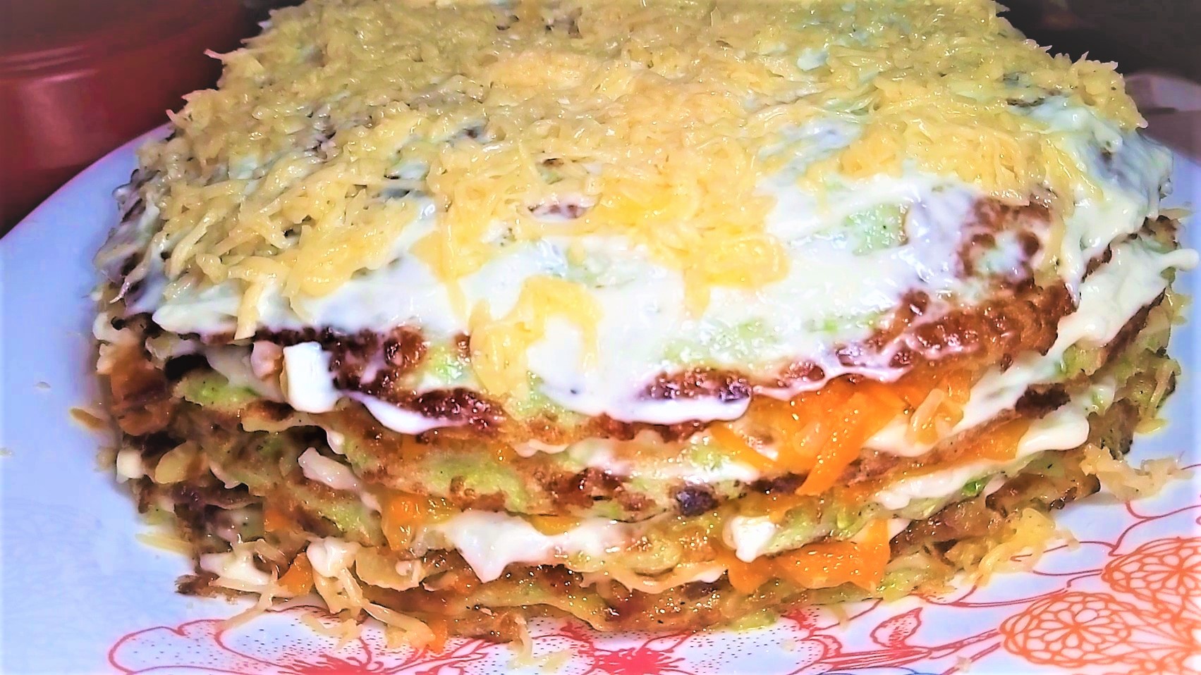 6) Каждый блин смазать чесночным майонезом, сверху тонким слоем выложить 2-3 ст.л. обжаренного лука с морковью, посыпать тертым сыром. По желанию можно выложить кольца помидор. Таким способом смазываем каждый блин. Украшаем торт на свой вкус.