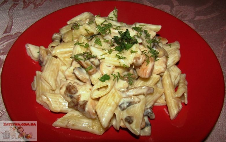 Макароны с курицей, грибами и сыром