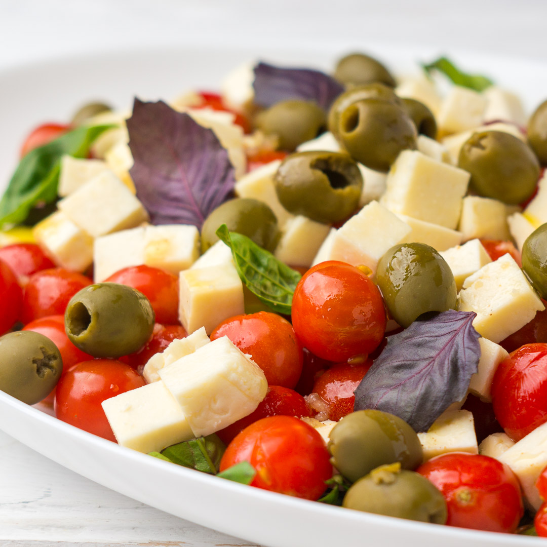 По-летнему свежий и легкий салат из помидоров черри и базилика. Салат получается невероятно вкусный, благодаря оригинальной кисло-сладкой заправке для салата.
