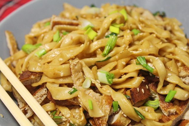 На сковороду насыпаем кунжут, обжариваем. Добавляем часть зеленого лука и лапшу, обжариваем. Добавляем соевый соус, хорошо перемешиваем.