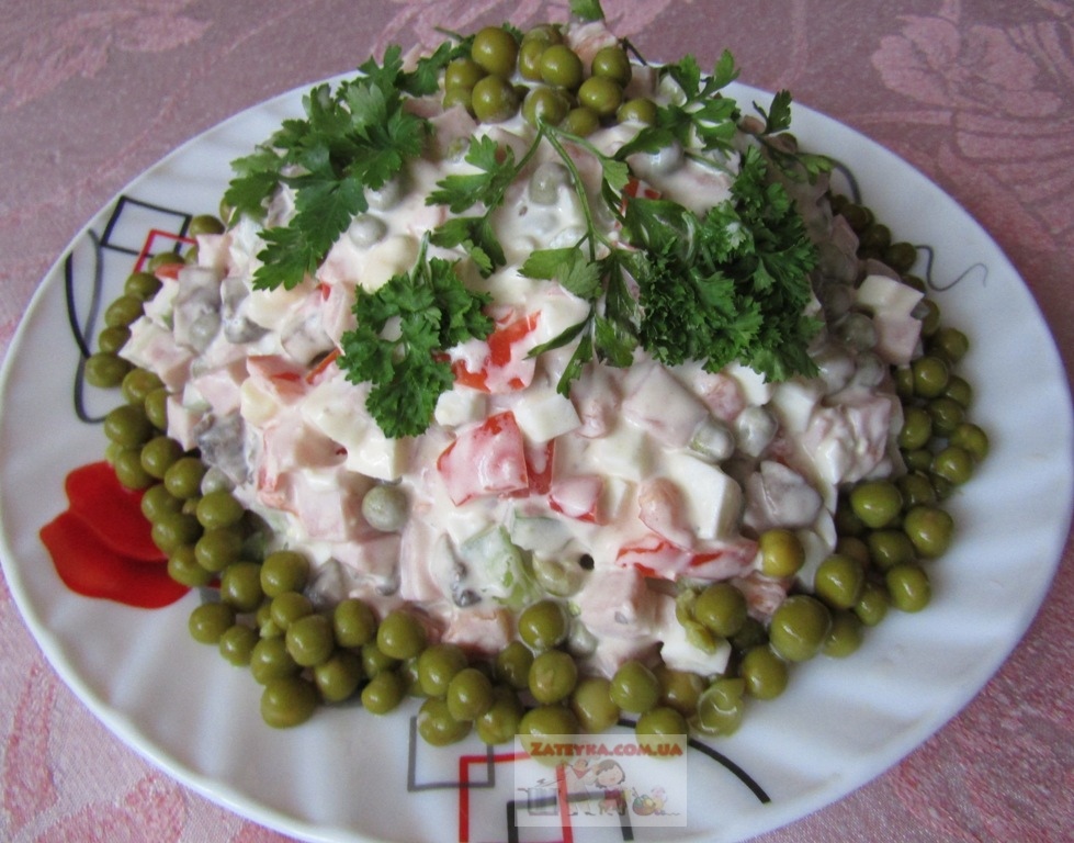 Яйца отварить до готовности (10 мин.), грибы порезать и обжарить на растительном масле. Ветчину, яйца, помидоры и сладкий перец порезать кубиками. С горошка слить жидкость и промыть. Все ингредиенты соединить в глубокой миске, посолить, поперчить, добавить майонез и перемешать. Выложить в салатник горкой, украсить зеленью и зеленым горошком.