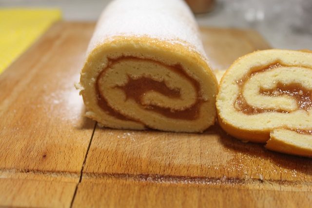 Готовый рулет еще горячим заворачиваем в не тугой рулон в чистое полотенце, даем остыть. Затем смазываем начинкой (у меня домашнее яблочное повидло). Заворачиваем в рулет и убираем в холодильник минимум на 1 час, а лучше на ночь.