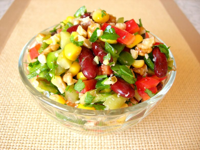 4. Смешиваем измельченные ингредиенты, добавляем консервированную фасоль и кукурузу.