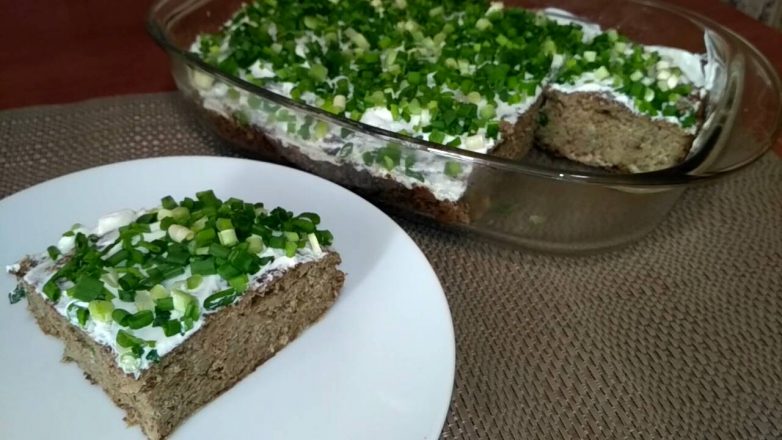 7.Даем слегка остыть нашей запеканке, смазываем сверху сметаной и посыпаем мелко нарезанным зеленым луком.