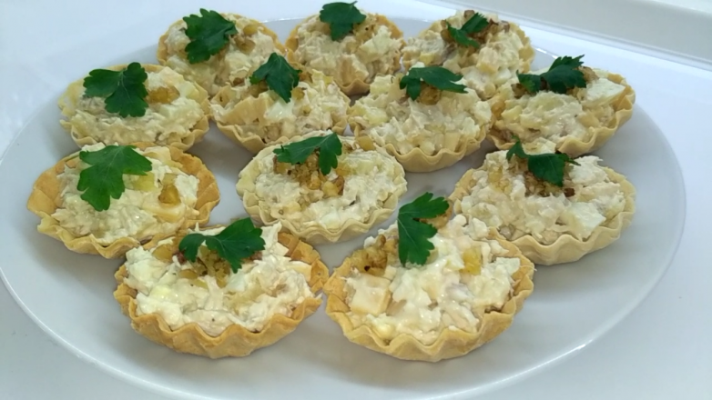Салат можно сделать заранее, а наполнять тарталетки необходимо перед подачей к столу.