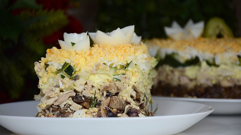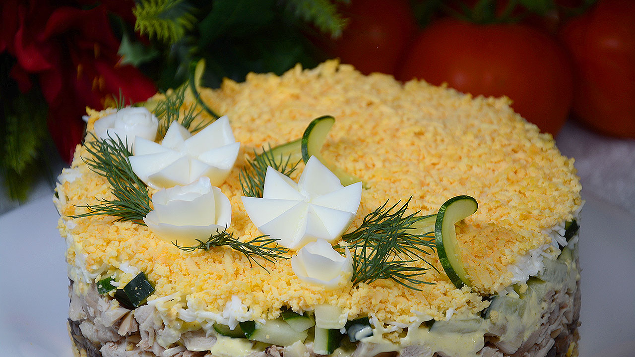 Всем привет! Предлагаю приготовить праздничный слоеный салат с курицей и грибами. Красивое оформление порадует гостей уже только одним своим видом. Да и вкусом все останутся довольны. Салат вкусный, сытный, красивый и насыщенный. Попробуйте и пусть ваши гости удивятся вашим кулинарным талантам!