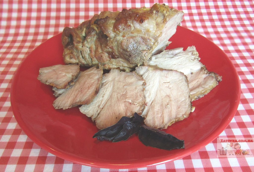 По окончании времени маринования свинину достаем из холодильника, плотно заворачиваем в фольгу и отправляем в предварительно разогретую до 180 градусов духовку на 1 час. Затем снимаем фольгу, увеличиваем температуру до 220 градусов и отправляем еще на 10 минут до зарумянивания. Остывшую свинину нарезаем и кушаем.