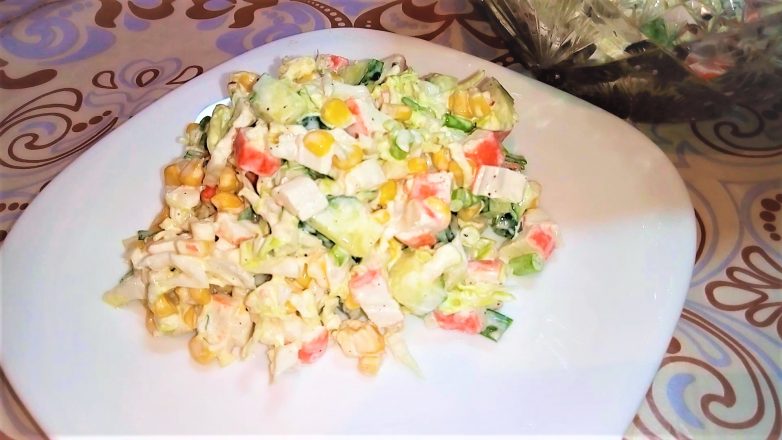 Нарезаем пекинскую капусту, огурец, крабовые палочки, лук зеленый отправляем в глубокую тарелку, добавляем кукурузу, молотый черный перец. майонез и аккуратно размешиваем. Сразу подаем к столу! Приятного аппетита!!!