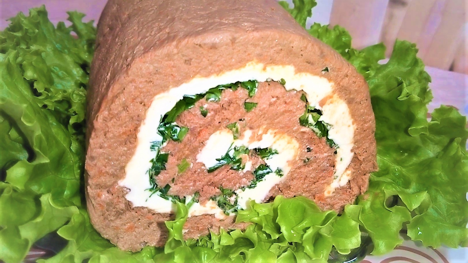 Очень вкусный и красивый рулет из печени со сливочным маслом и зеленью!