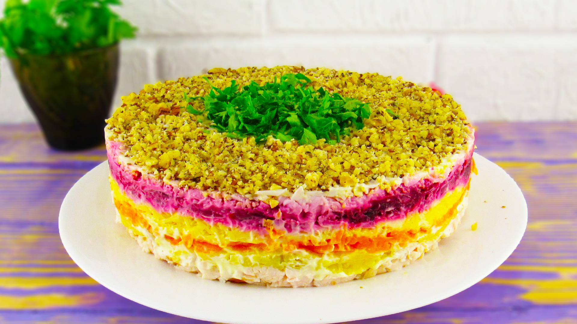 8. По истечению времени, достаём салат, по кругу посыпаем орехами, а серединку присыпаем измельченной петрушкой. Перед подачей снимаем форму и подаём на стол наш вкуснейший салат!