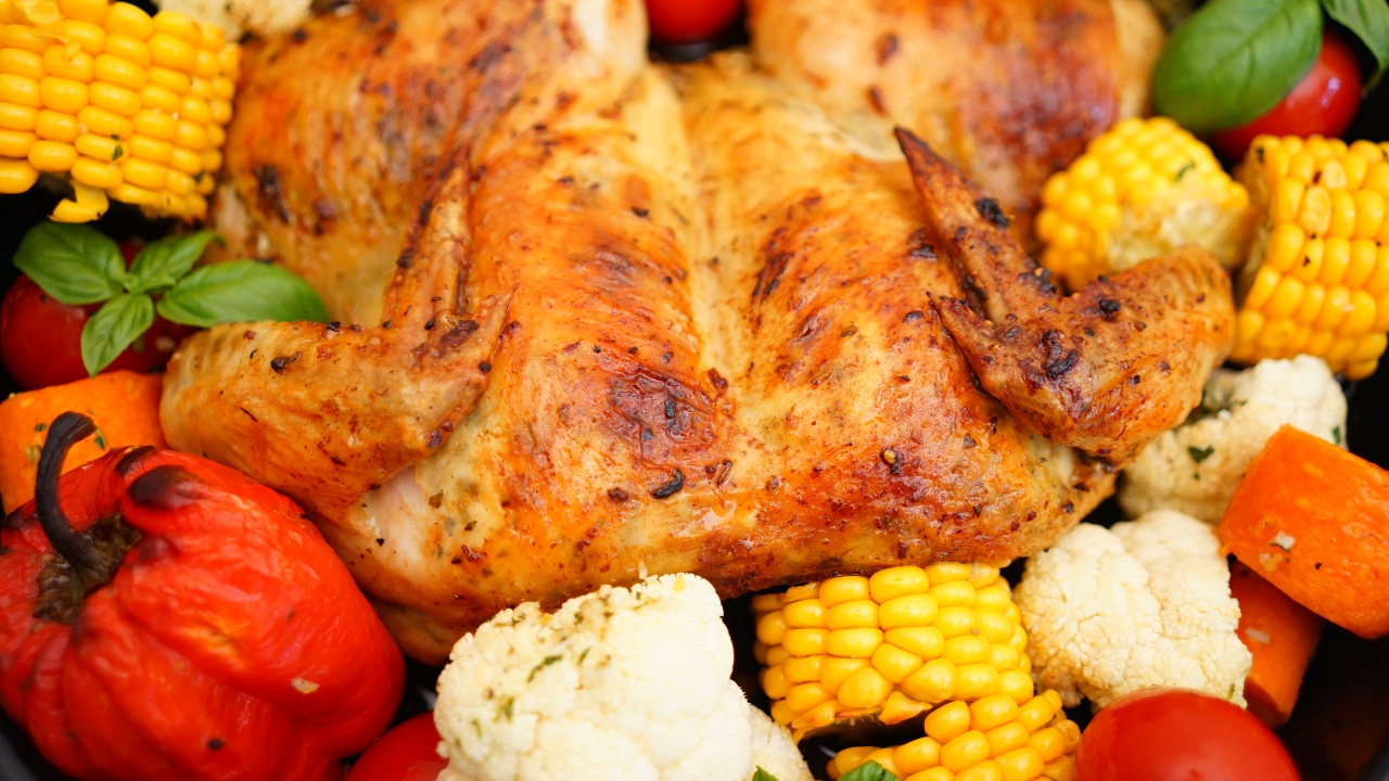 4. Перевернем курочку вверх грудкой. Аккуратно отодвинем кожицу (смотрите, пожалуйста, видео). И «нафаршируем» полученной смесью карман между мясом курочки и кожицей (смотрите, пожалуйста, видео). Часть ароматного масла оставим для овощей.